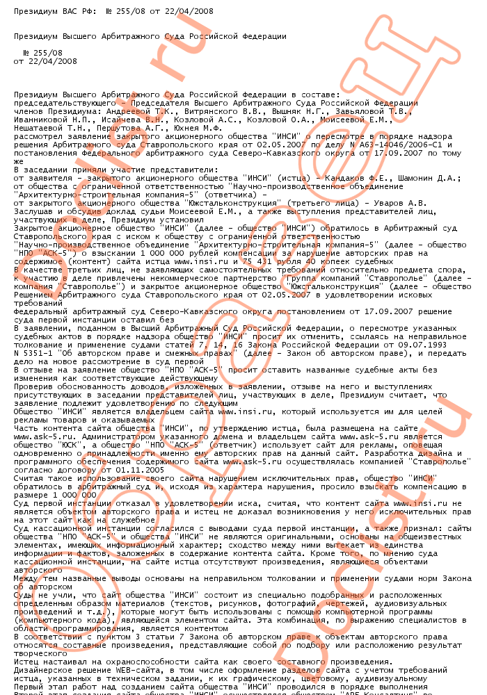 Президиум ВАС РФ: № 255/08 от 22/04/2008 скачать образец документа