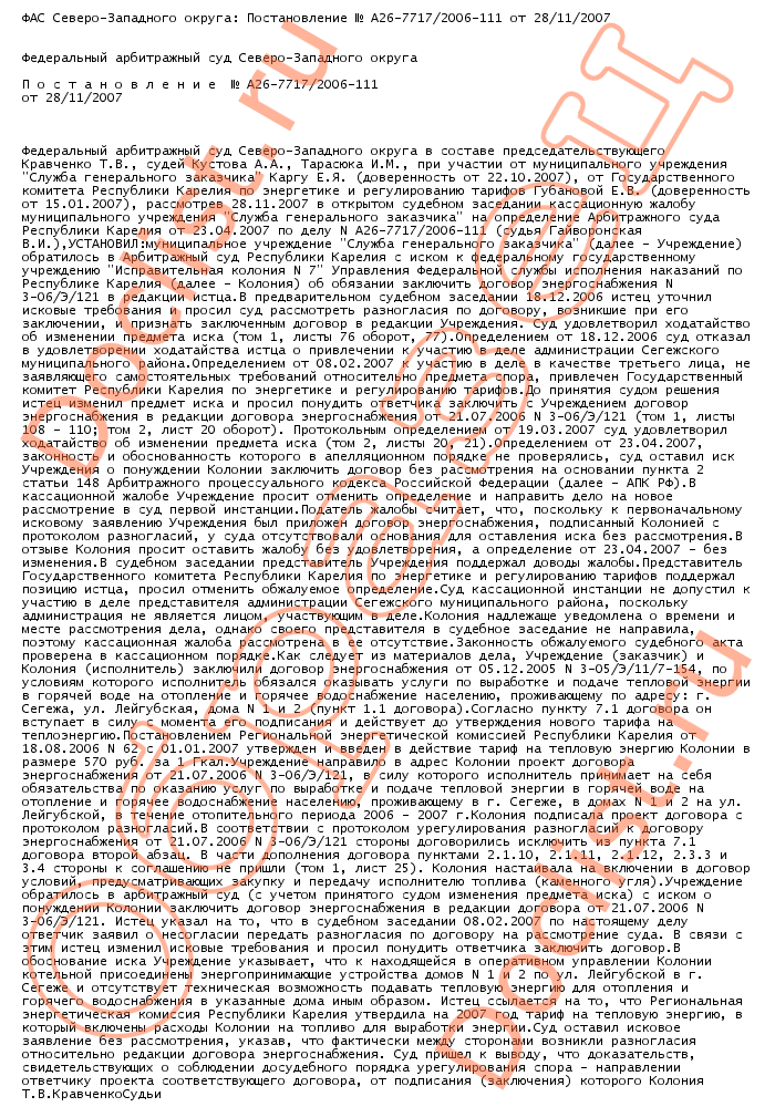 ФАС Северо-Западного округа: Постановление № А26-7717/2006-111 от 28/11/2007 скачать образец документа