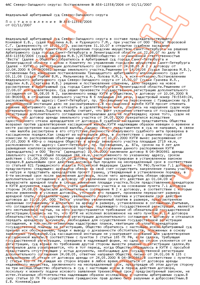 Главная :: Документы :: Гражданские правовые документы (письма, соглашения, уведомления, извещения, акты) :: ФАС Северо-Западного округа: Постановление № А56-11558/2006 от 02/11/2007