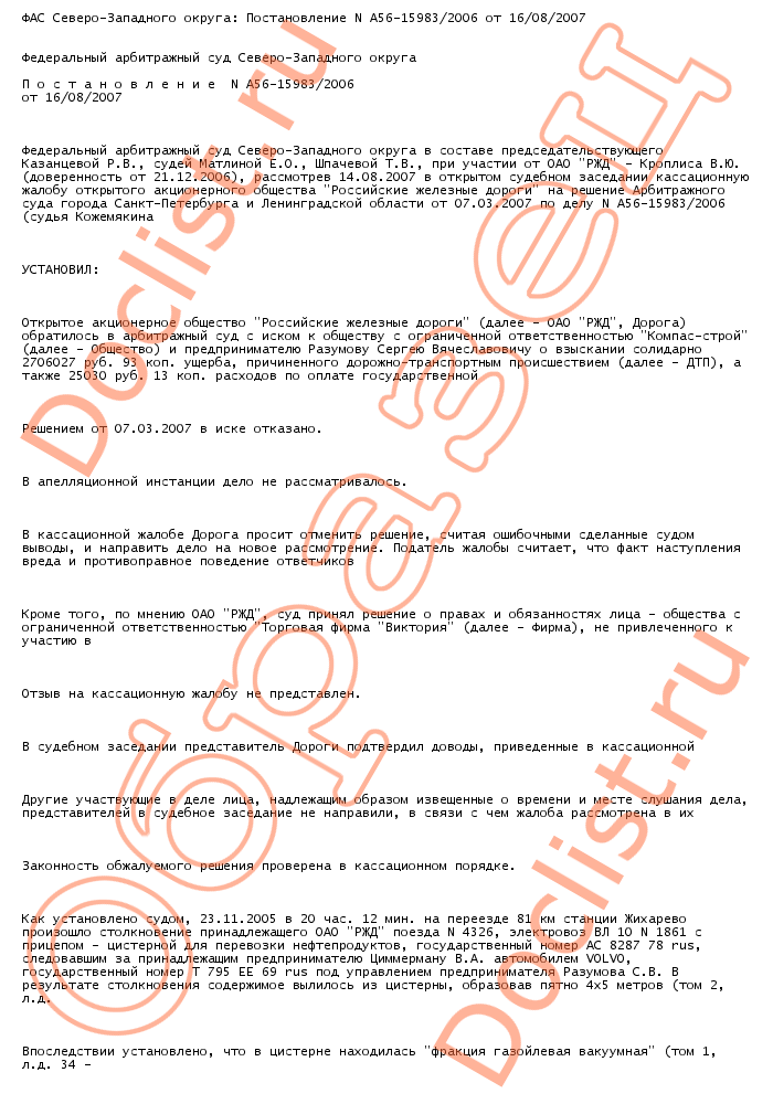 ФАС Северо-Западного округа: Постановление N А56-15983/2006 от 16/08/2007 скачать образец документа