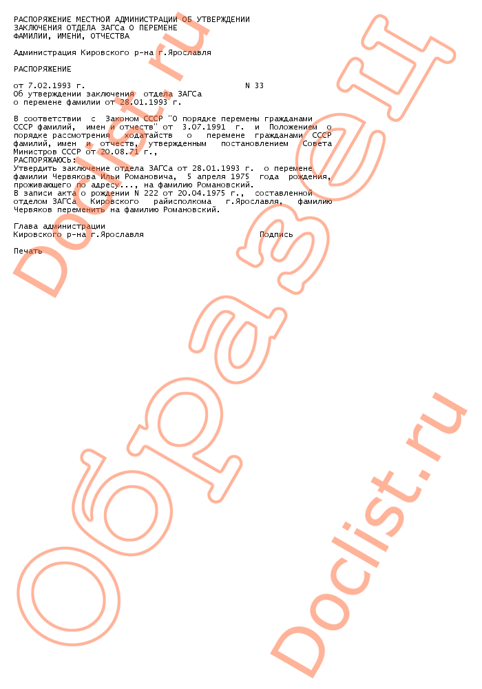 Распоряжение местной администрации об утверждении заключения отдела загса о перемене фамилии, имени, скачать образец документа