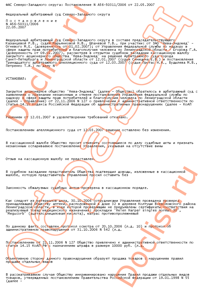 ФАС Северо-Западного округа: Постановление № А56-50311/2006 от 22.05.2007 скачать образец документа