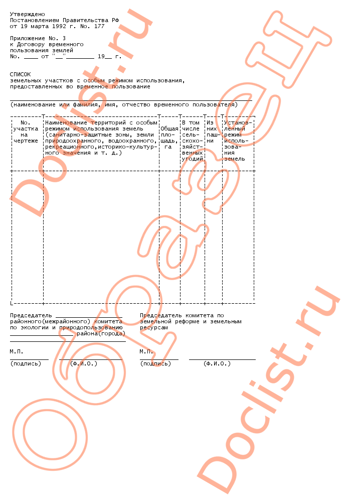 Список земельных участков с особым режимом использования, предоставленных во временное пользование (приложение к договору временного пользования землей сельскохозяйственного назначения) скачать образец документа