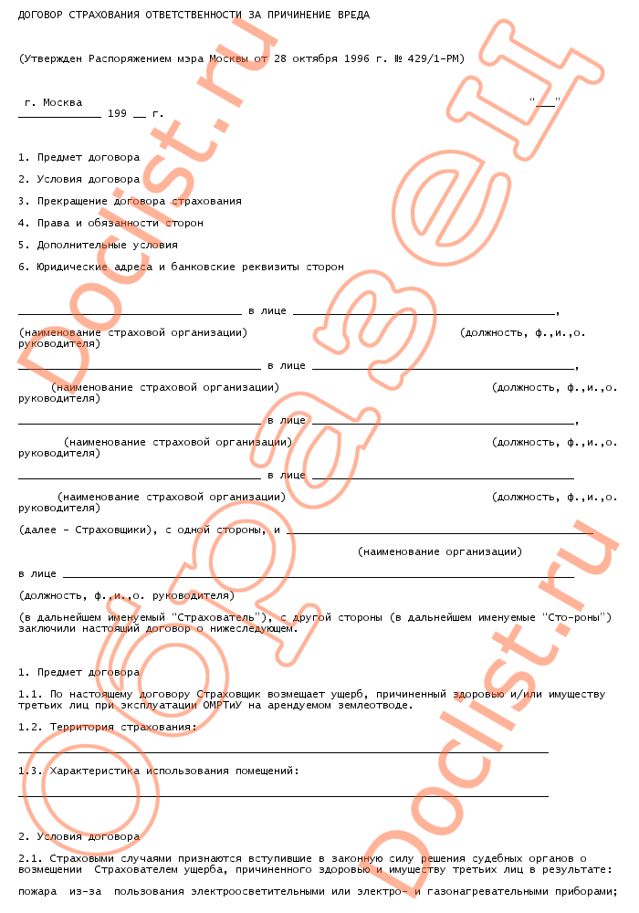 Договор страхования ответственности за причинение вреда (утвержден распоряжением мэра москвы от 28 октября 1996 г. № 429/1-рм) скачать образец
