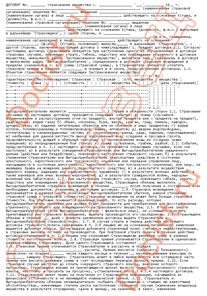 Договор страхования имущества (страхователь - физическое или юридическое лицо; в пользу выгодоприобретателя - физического или юридического лица; сострахование) скачать образец
