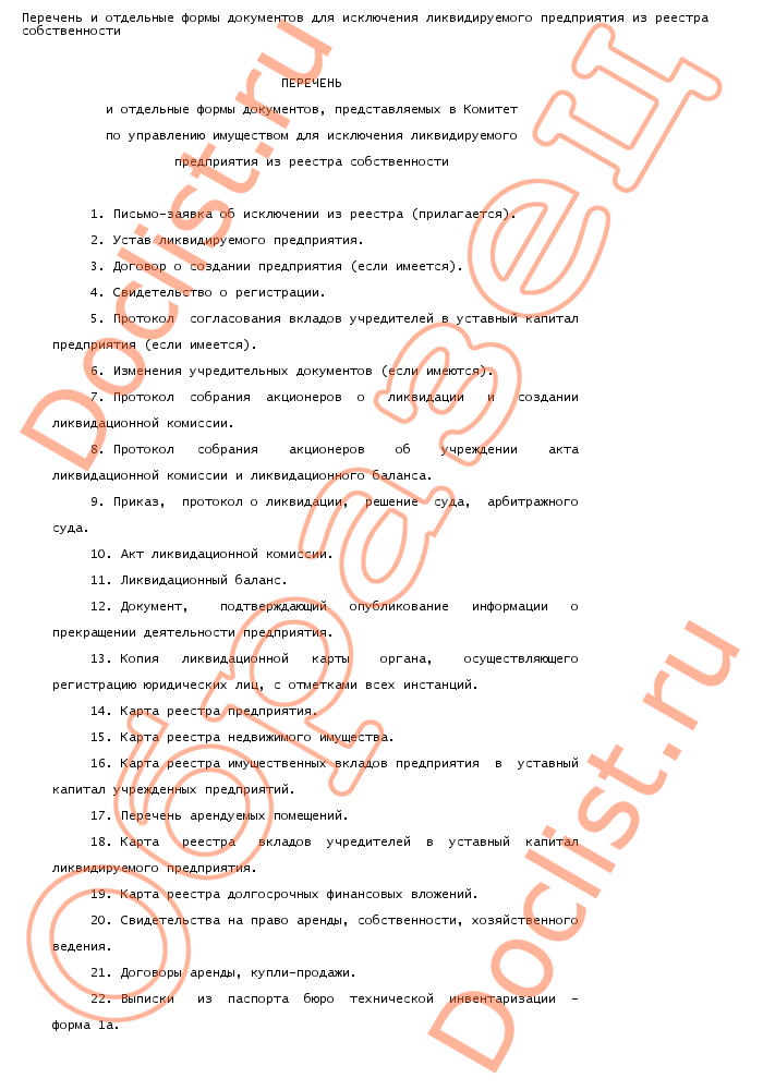 Перечень и отдельные формы документов для исключения ликвидируемого предприятия из реестра собственности скачать образец
