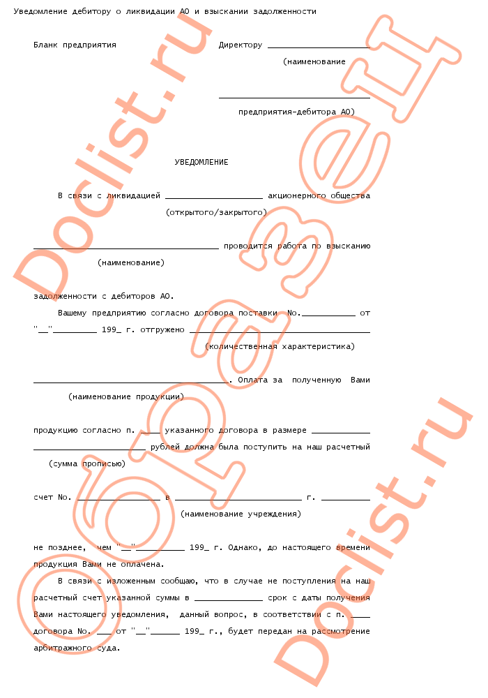 Уведомление дебитору о ликвидации ао и взыскании задолженности скачать образец документа