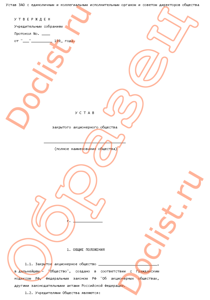 Устав зао с единоличным и коллегиальным исполнительным органом и советом директоров общества скачать образец документа