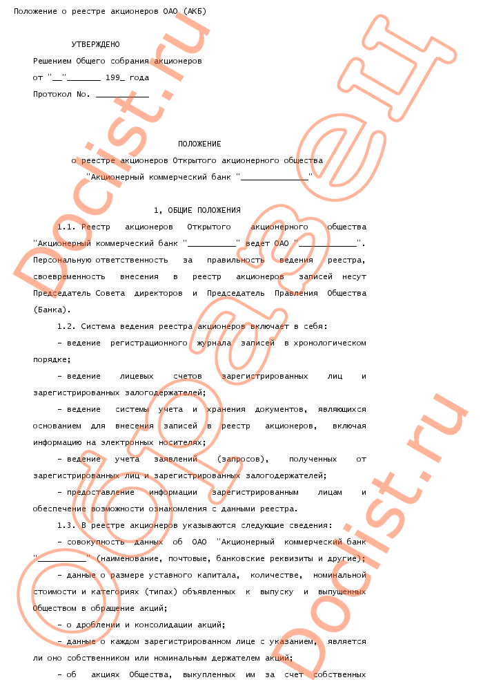 Положение о реестре акционеров оао (акб) скачать образец документа