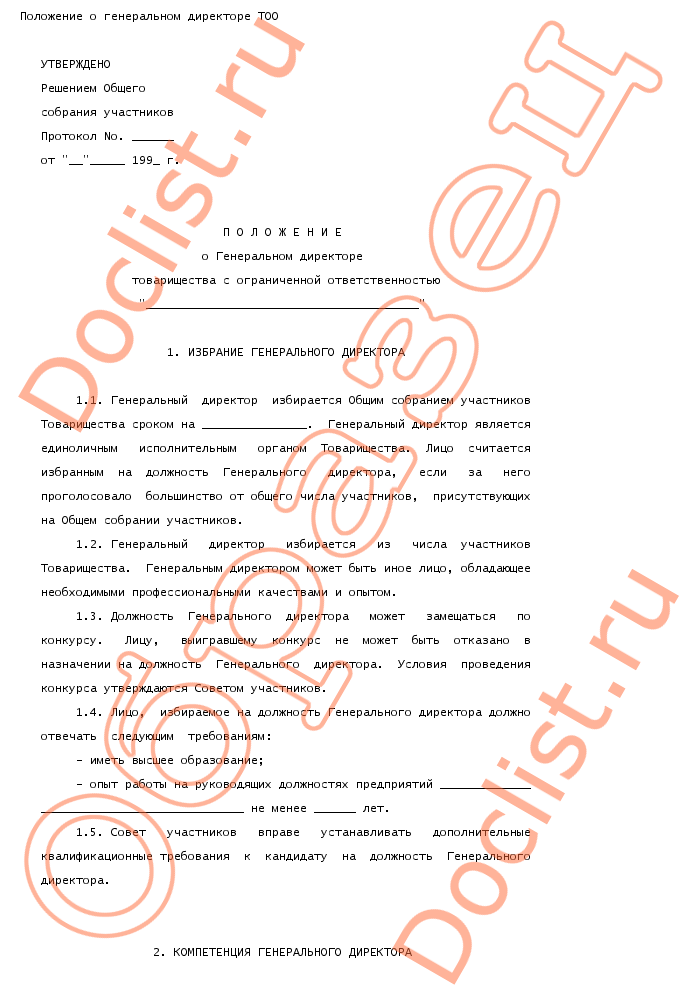 Главная :: Документы :: Документы по ликвидации, реорганизации предприятий :: Положение о генеральном директоре ТОО