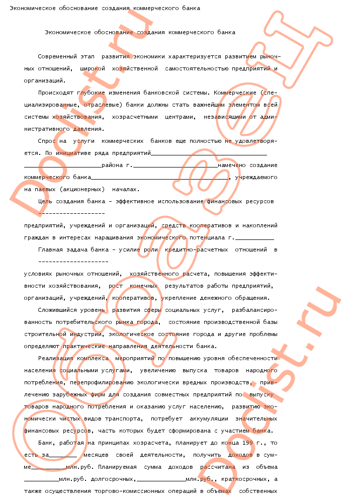 Экономическое обоснование создания коммерческого банка скачать образец документа