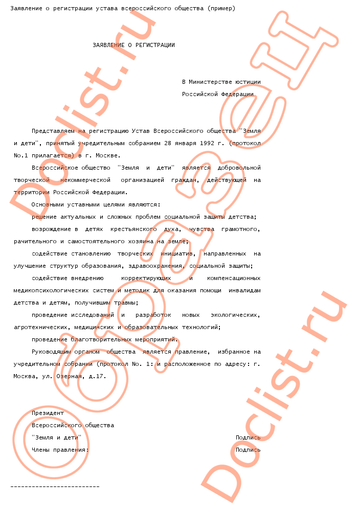 Заявление о регистрации устава всероссийского общества скачать образец документа