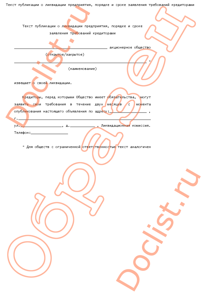 Текст публикации о ликвидации предприятия, порядке и сроке заявления требований кредиторами скачать образец документа
