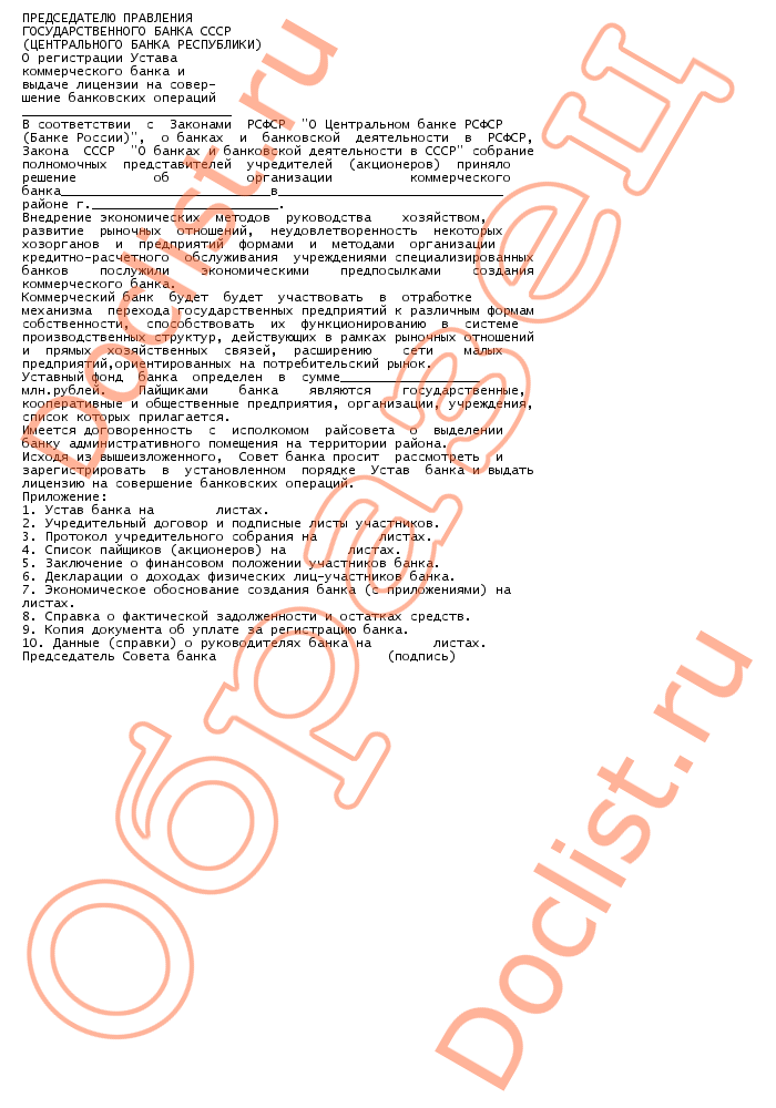 Заявление о регистрации устава коммерческого банка и выдаче лицензии скачать образец документа