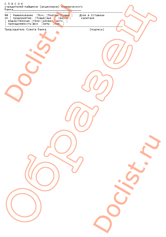 Список учредителей-пайщиков (акционеров) коммерческого банка скачать образец документа