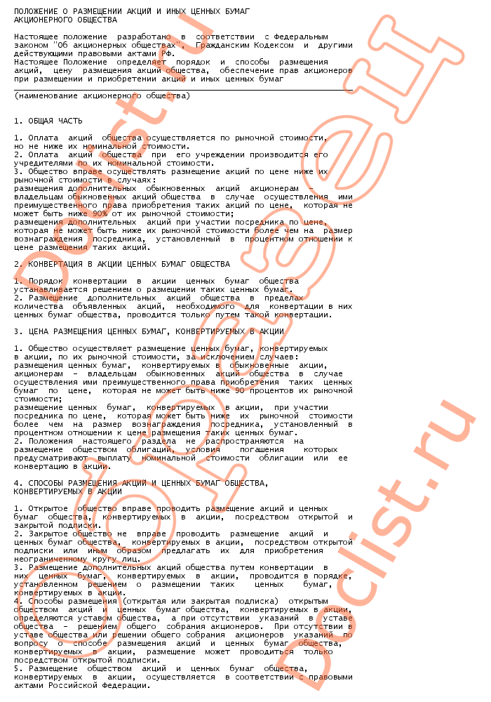 Положение о размещении акций и иных ценных бумаг акционерного общества (типовая форма) скачать образец документа