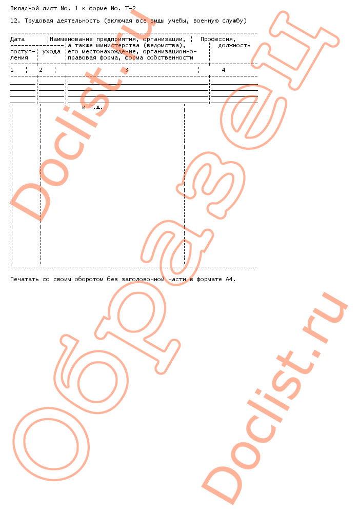 Образец вкладного листа nо. 1 к форме nо. Т-2 (письмо ГНС РФ от 20. 10. 95 n пв-4-17/69н) скачать документ