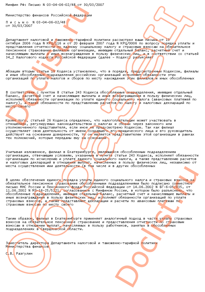 Минфин РФ: Письмо N 03-04-06-02/48 от 30/03/2007 скачать образец документа