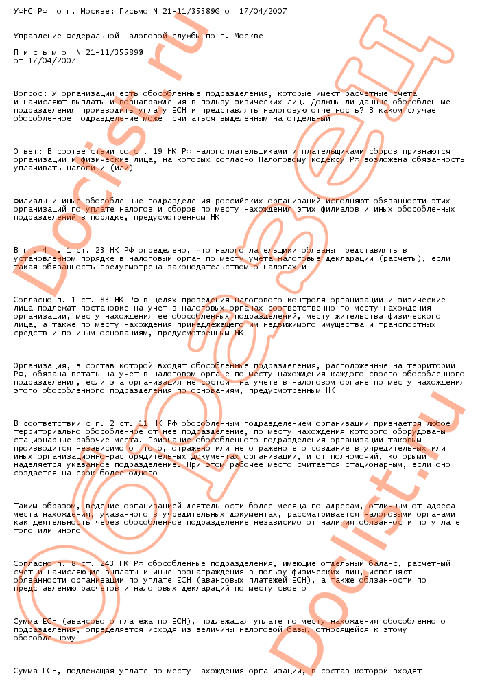 УФНС РФ по г. Москве: Письмо N 21-11/35589@ от 17/04/2007 скачать образец документа