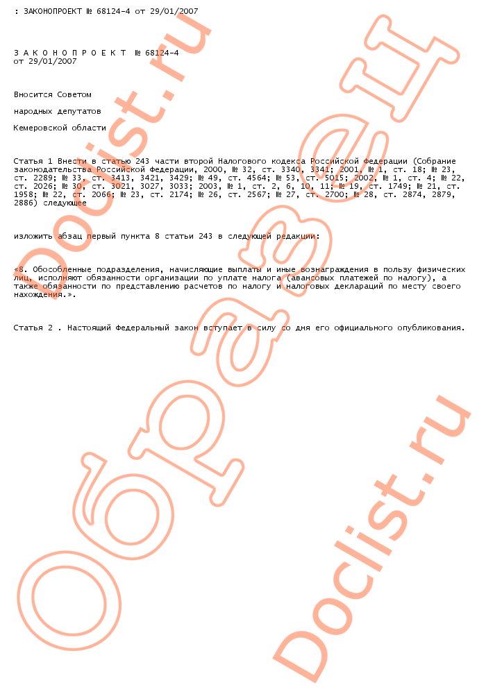 : ЗАКОНОПРОЕКТ № 68124-4 от 29/01/2007 скачать образец документа