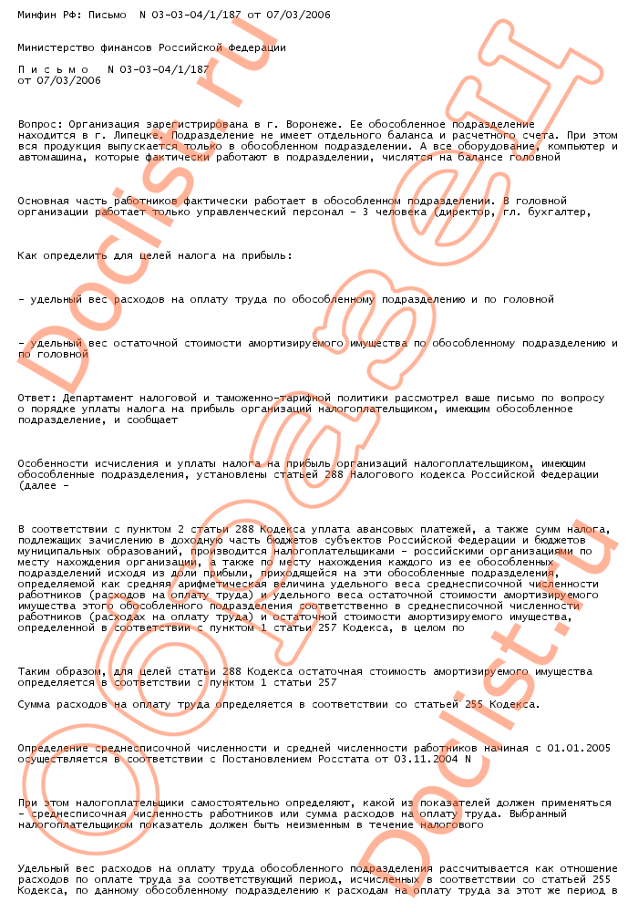 Минфин РФ: Письмо N 03-03-04/1/187 от 07/03/2006 скачать образец документа