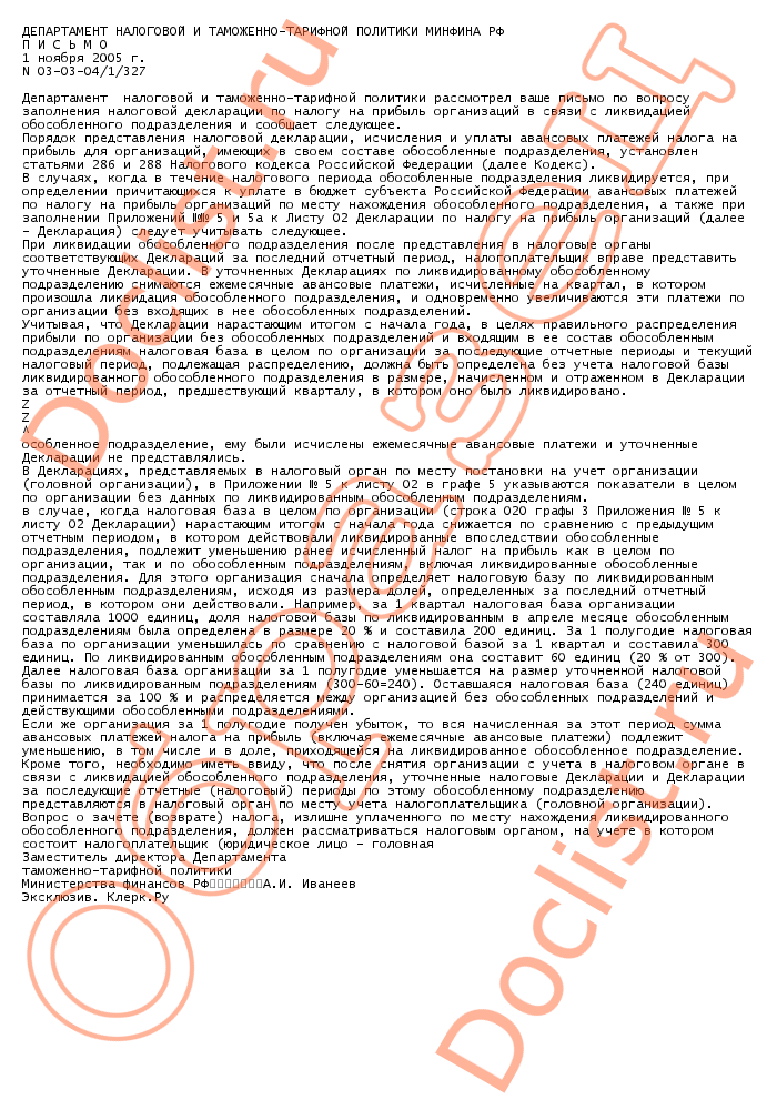 Главная :: Документы :: Документы по ликвидации, реорганизации предприятий :: Письмо Минфина РФ от 01.11.2005 г. N 03-03-04/1/327