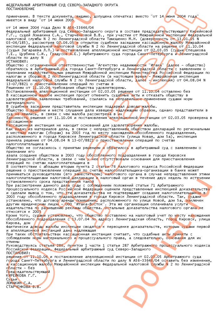Постановление ФАС РФ Северо-Западного округа от 14.06.2005 г. № А56-33646/04 скачать образец документа