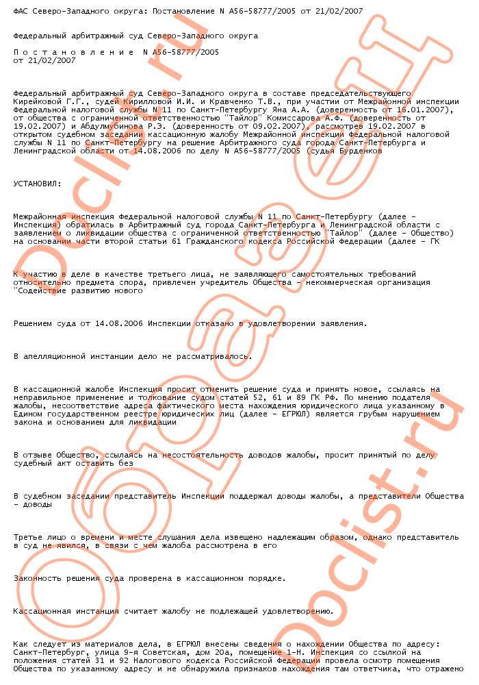 Главная :: Документы :: Документы по ликвидации, реорганизации предприятий :: ФАС Северо-Западного округа: Постановление N А56-58777/2005 от 21/02/2007