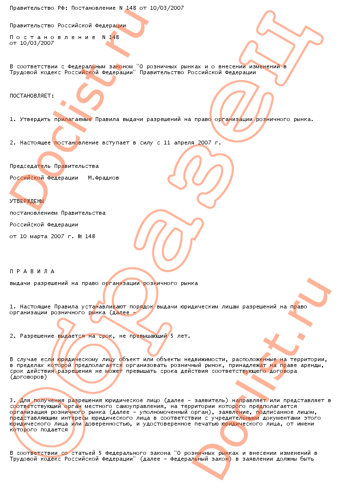 Правительство РФ: Постановление N 148 от 10/03/2007 скачать образец документа