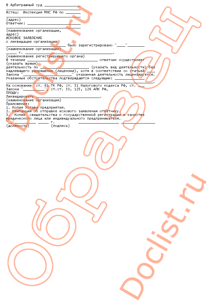 Главная :: Документы :: Документы по ликвидации, реорганизации предприятий :: Исковое заявление о ликвидации организации