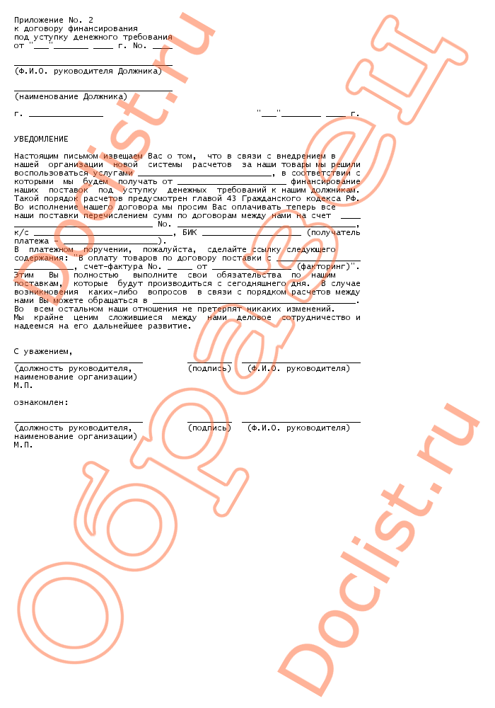 Уведомление об уступке денежных требований к должнику (приложение к договору финансирования под уступку денежного требования) скачать образец документа