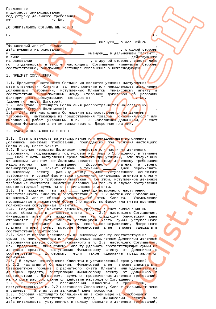 Главная :: Документы :: Финансирование под уступку денежного требования :: Дополнительное соглашение (приложение к договору финансирования под уступку денежного требования)