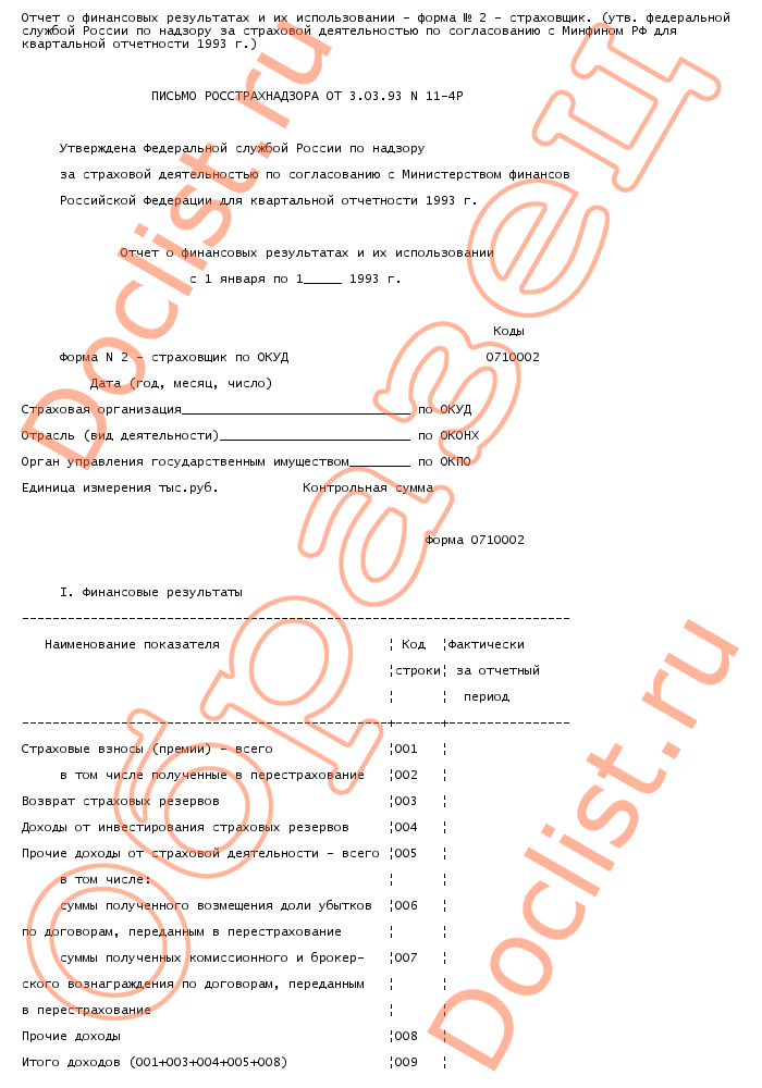 Отчет о финансовых результатах и их использовании - форма № 2 - страховщик. (утв. Федеральной службой россии по надзору за страховой деятельностью по согласованию с минфином РФ для квартальной отчетности 1993 г. ) скачать образец документа