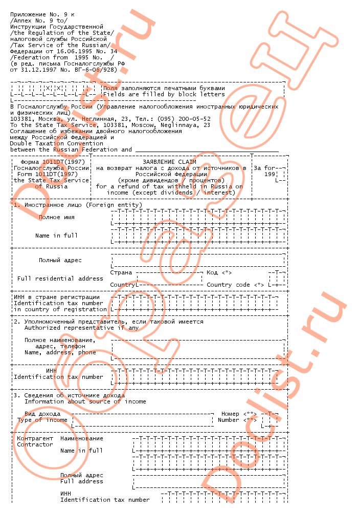Заявление на возврат налога с доходов от источников в Российской Федерации (кроме дивидендов/процентов) (экз. nо. 4). Claim for a refund of tax withheld in russia on income (except dividends/interest) (copy nо. 4). Форма nо. 1011dt(1997) (рус./англ.) скачать образец документа
