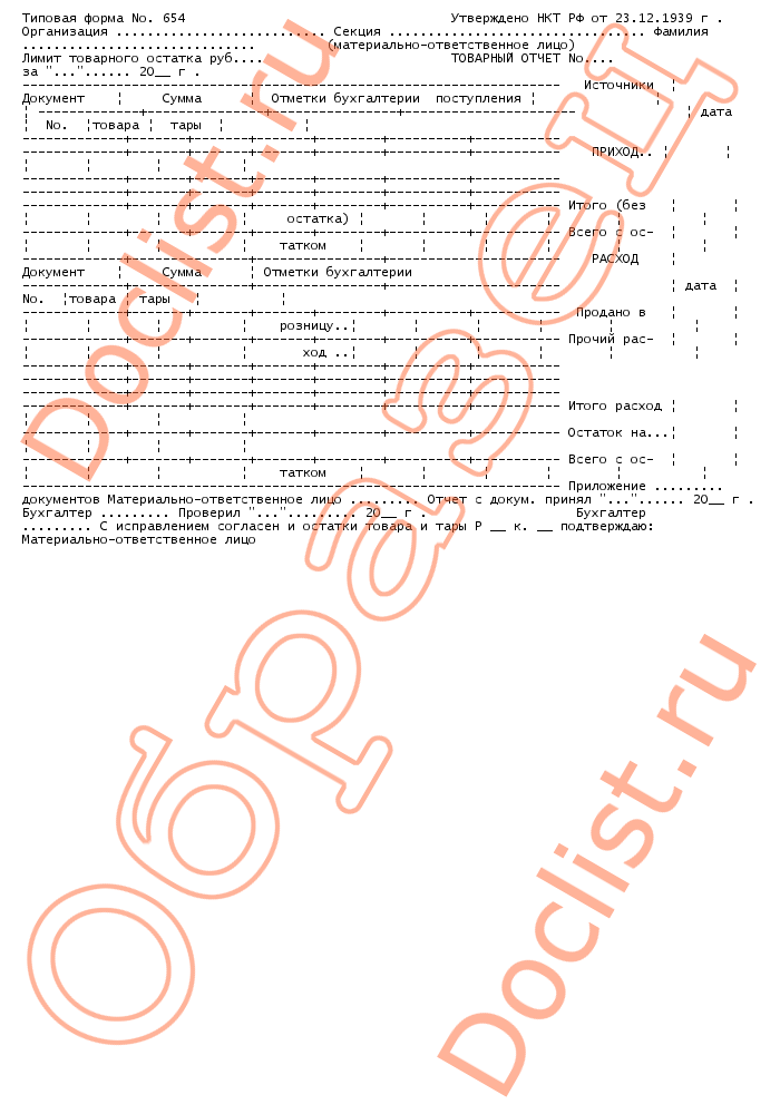 Товарный отчет. Форма nо. 654 (утв. Приказом нкт РФ от 23. 12. 1939) скачать образец документа