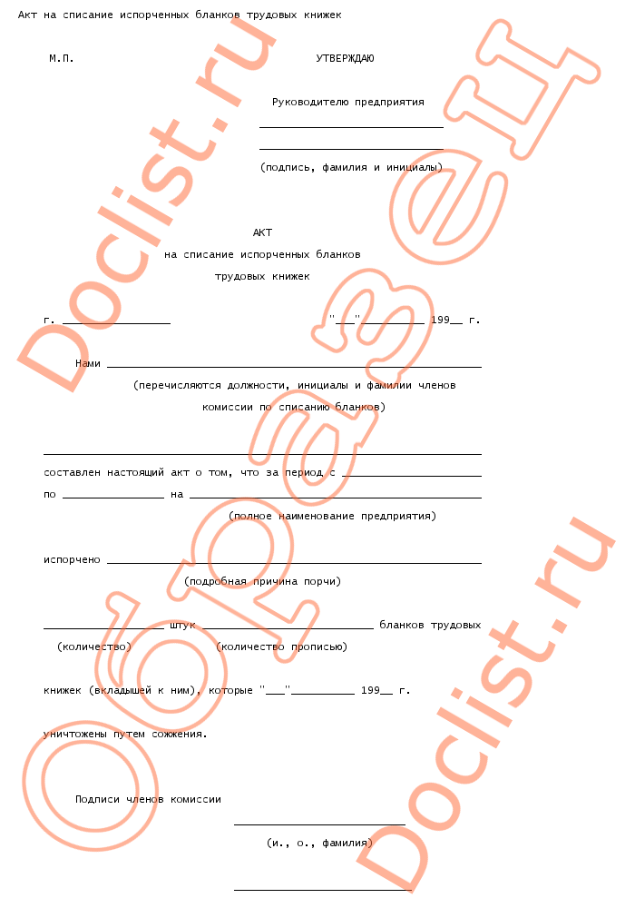 Акт на списание испорченных бланков трудовых книжек скачать образец документа
