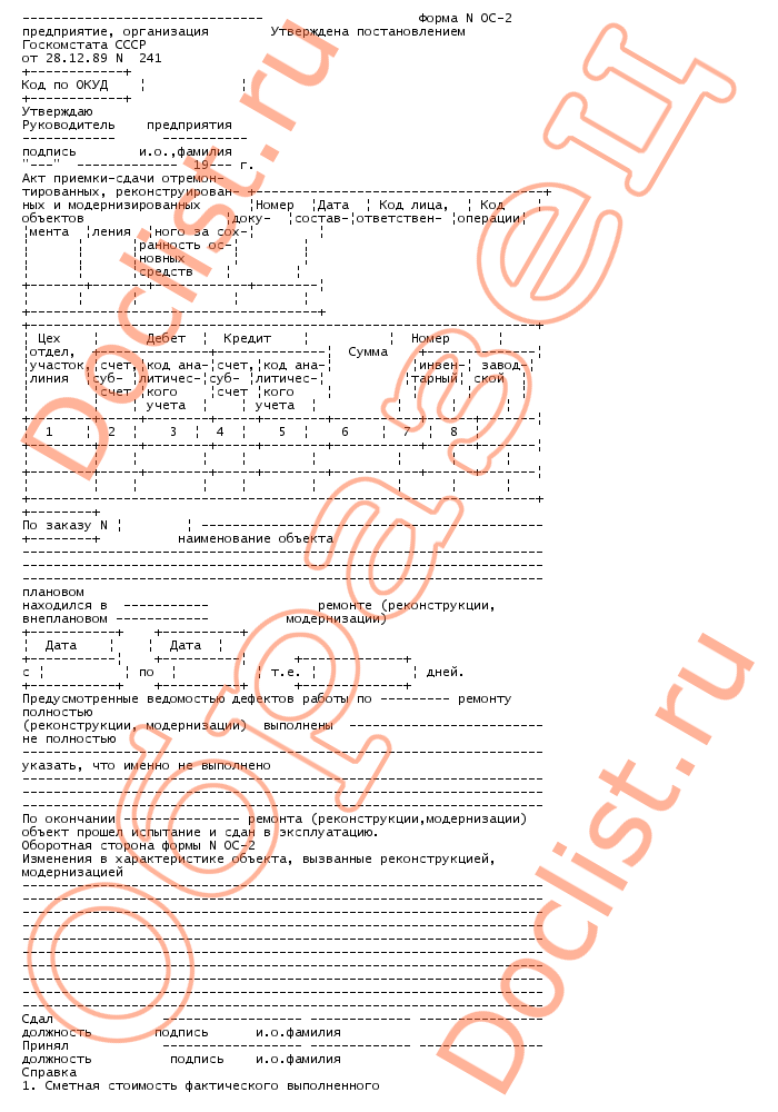 Акт приемки-сдачи отремонтированных, реконструированных и модернизированных объектов (форма n ос-2, утверждена постановлением госкомстата СССР от 28. 12. 89 n 241) скачать образец документа