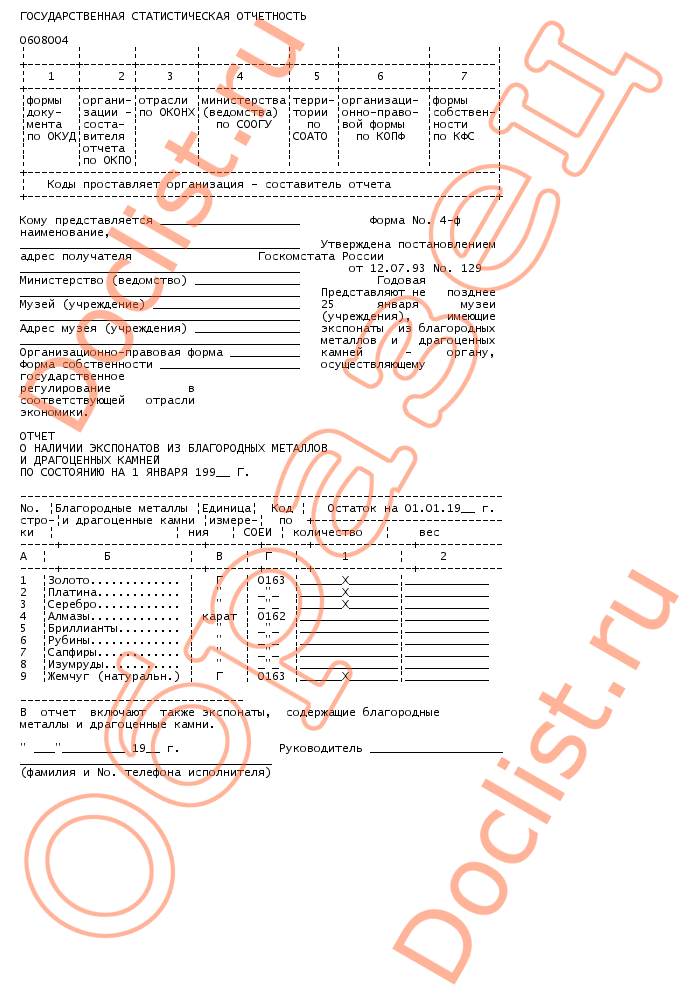 Отчет о наличии экспонатов из благородных металлов и драгоценных камней. Форма n 4-ф (постановление госкомстата РФ от 12. 07. 93 n 129 (ред. от 13. 12. 94 n 253)) скачать образец документа