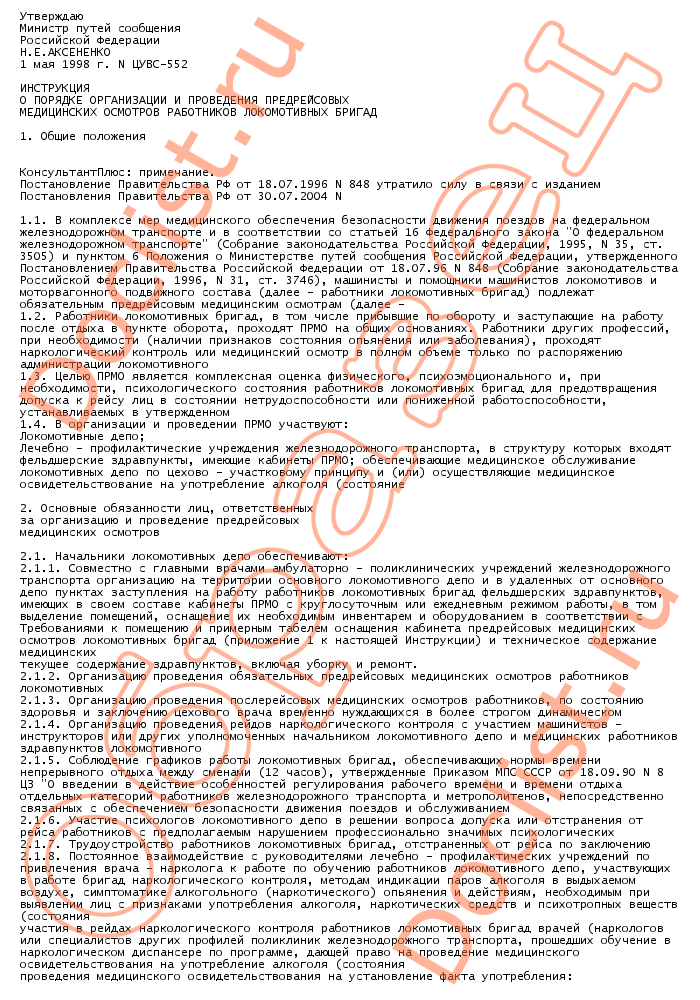 Инструкция о порядке организации ипроведения предрейсовых медицинских осмотров работников локомотивных бригад скачать
