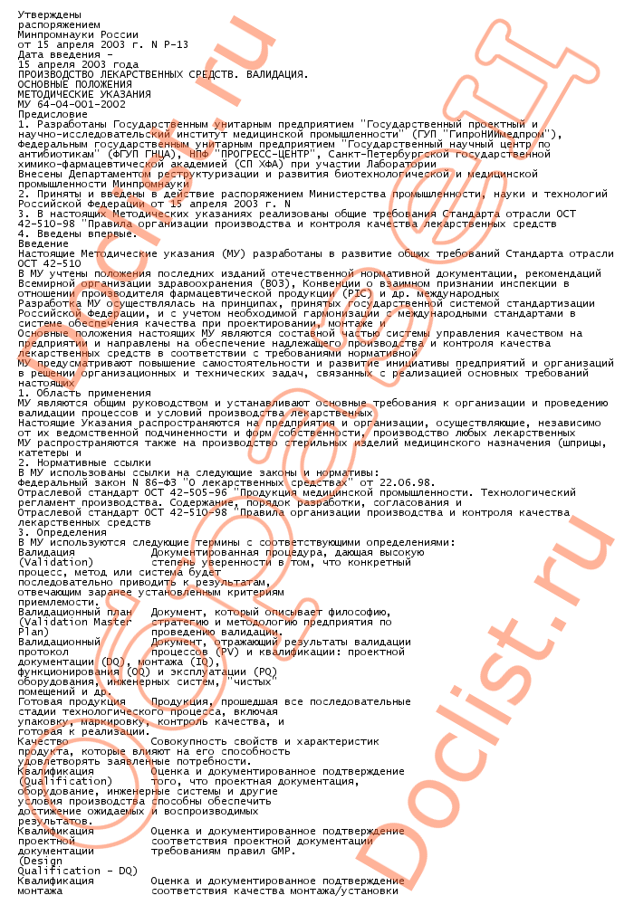 МУ 64-04-001-2002 Производство лекарственных средств. Валидация. Основные положения скачать