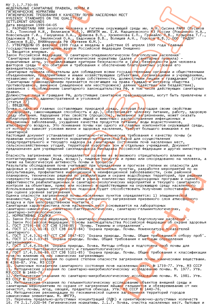 Главная :: Нормативы и стандарты :: Методические указания (МУ) :: МУ 2.1.7.730-99 Гигиенические требования к качеству почвы населенных мест (взамен МУ 4266-87 в части проведения гигиенической оценки степени биологического и химического загрязнения почв)