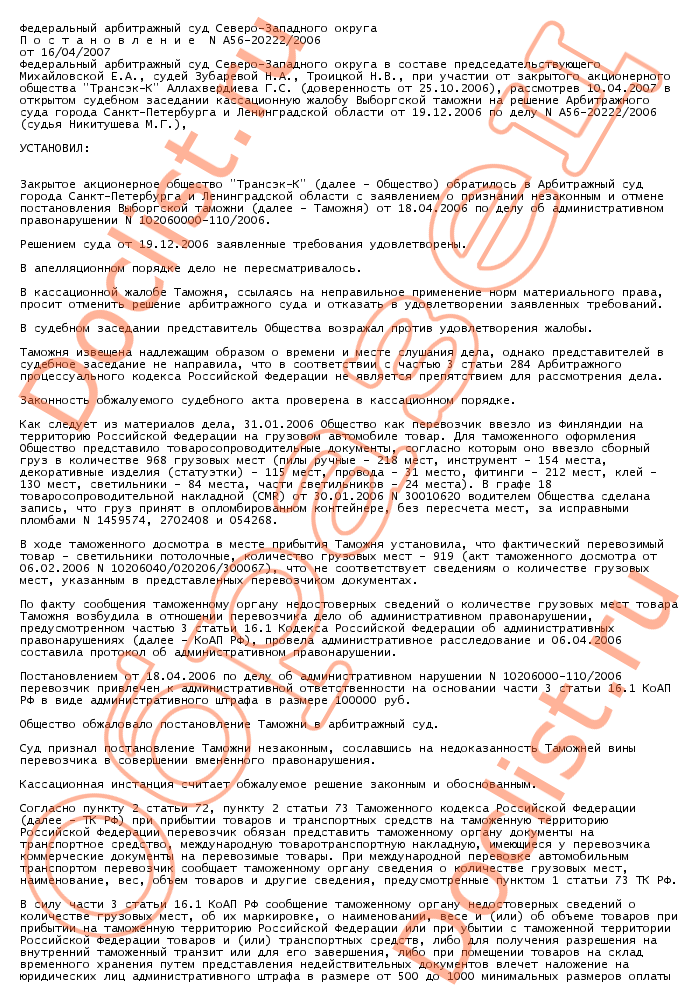 ФАС Северо-Западного округа: Постановление N А56-20222/2006 от 16/04/2007 скачать образец документа