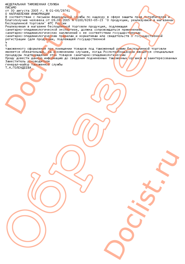 Письмо ФТС РФ от 30.08.2005 г. № 01-06/29741 "О направлении информации" скачать образец документа