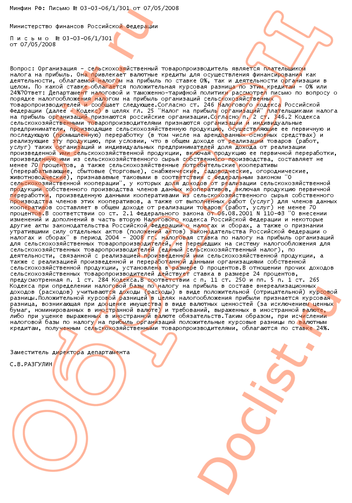 Минфин РФ: Письмо № 03-03-06/1/301 от 07/05/2008 скачать образец документа