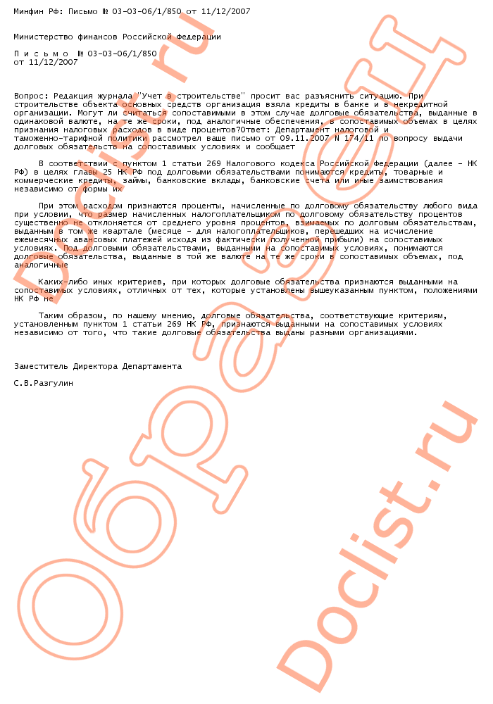 Минфин РФ: Письмо № 03-03-06/1/850 от 11/12/2007 скачать образец документа