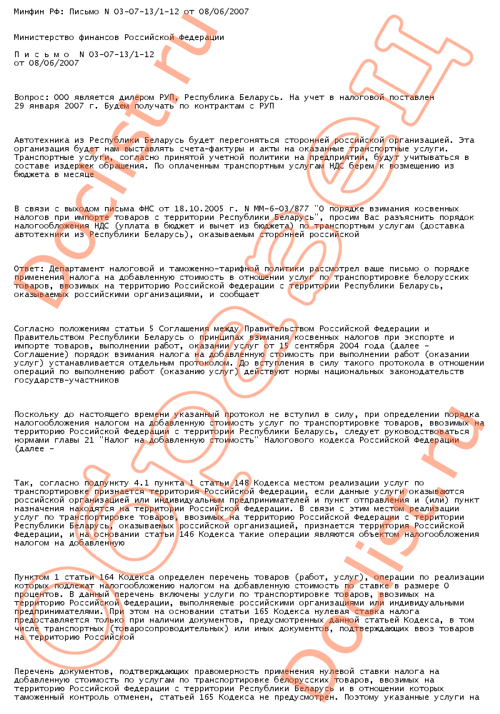Минфин РФ: Письмо N 03-07-13/1-12 от 08/06/2007 скачать образец документа