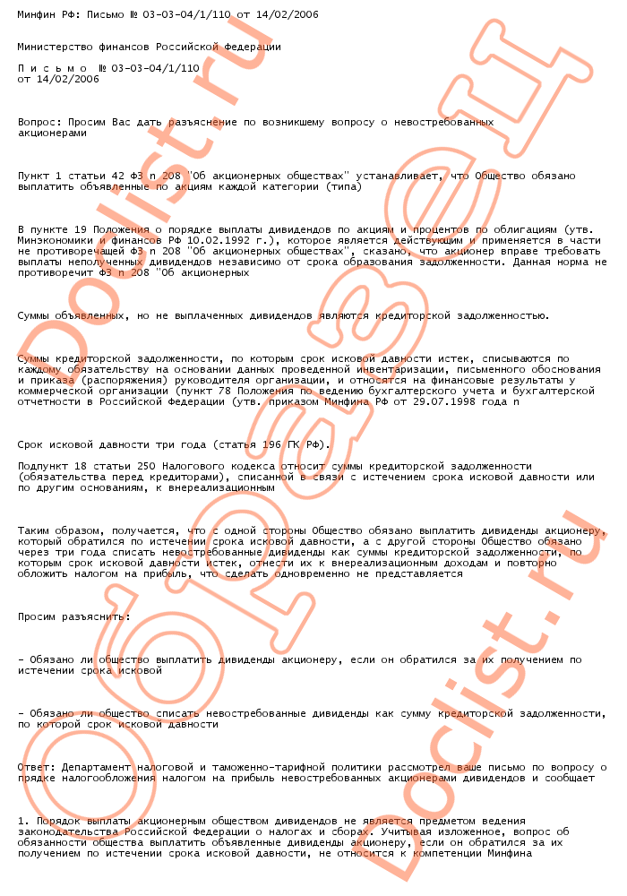 Минфин РФ: Письмо № 03-03-04/1/110 от 14/02/2006 скачать образец документа