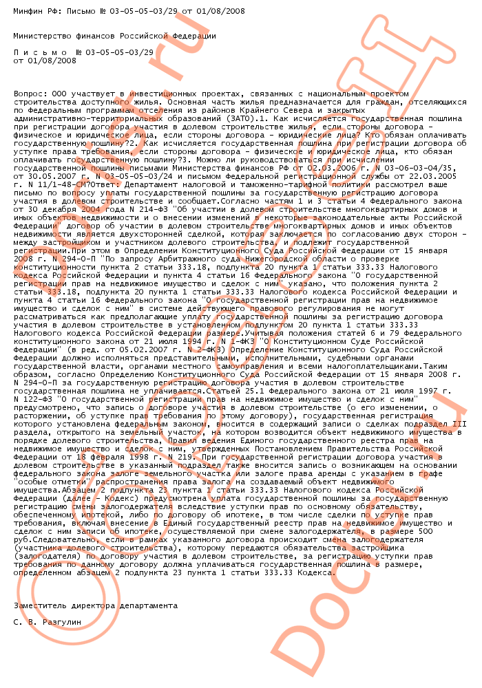 Описание: Министерство финансов Российской Федерации П и с ь м о № 03-05-05-03/29 от 01/08/2008 Вопрос: ООО участвует в инвестиционных проектах, связанных с национальным проектом строительства доступного жилья. Основная часть жилья предназначается для граждан, отселяющихся по Федеральным программам отселения из районов Крайнего Севера и закрытых административно-территориальных образований (ЗАТО).1. Как исчисляется государственная пошлина при регистрации договора участия в долевом...