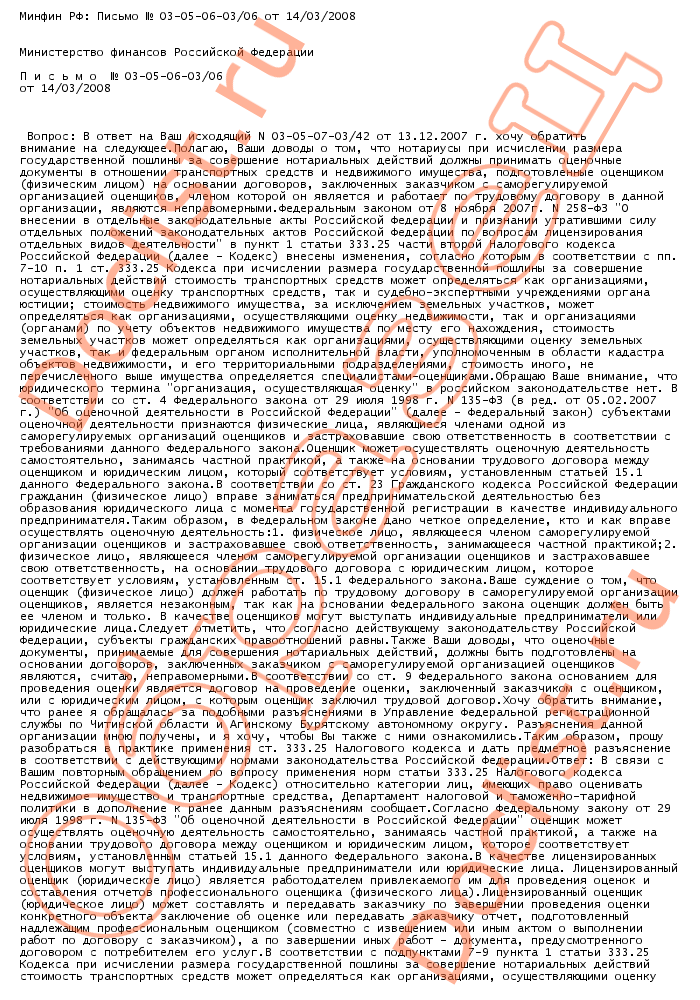 Паспорт файла Добавлен: 09.10.2008 Размер: 8.85 Кб Просмотров/Скачиваний: 391/0 Описание: Министерство финансов Российской Федерации П и с ь м о № 03-05-06-03/06 от 14/03/2008 Вопрос: В ответ на Ваш исходящий N 03-05-07-03/42 от 13.12.2007 г. хочу обратить внимание на следующее.Полагаю, Ваши доводы о том, что нотариусы при исчислении размера государственной пошлины за совершение нотариальных действий должны принимать оценочные документы в отношении транспортных средств и недвижимого имущества, подготовленные оценщиком (физическим лицом) на основании...