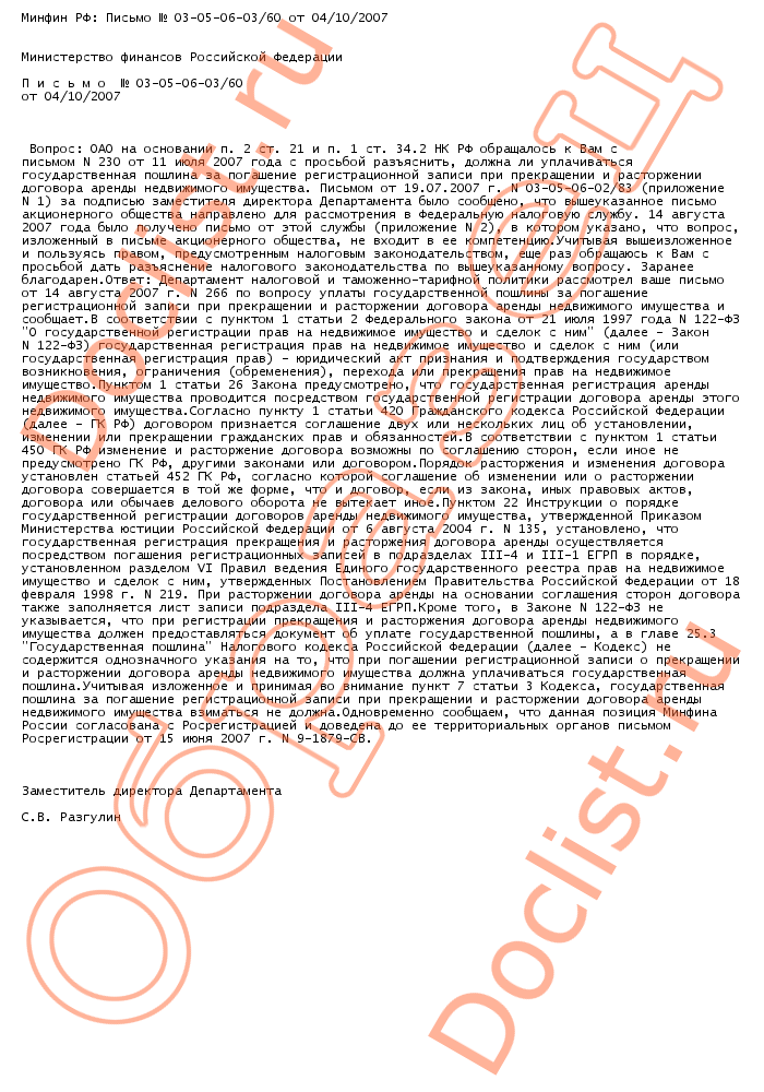 Описание: Министерство финансов Российской Федерации П и с ь м о № 03-05-06-03/60 от 04/10/2007 Вопрос: ОАО на основании п. 2 ст. 21 и п. 1 ст. 34.2 НК РФ обращалось к Вам с письмом N 230 от 11 июля 2007 года с просьбой разъяснить, должна ли уплачиваться государственная пошлина за погашение регистрационной записи при прекращении и расторжении договора аренды недвижимого имущества. Письмом от 19.07.2007 г. N 03-05-06-02/83 (приложение N 1) за...